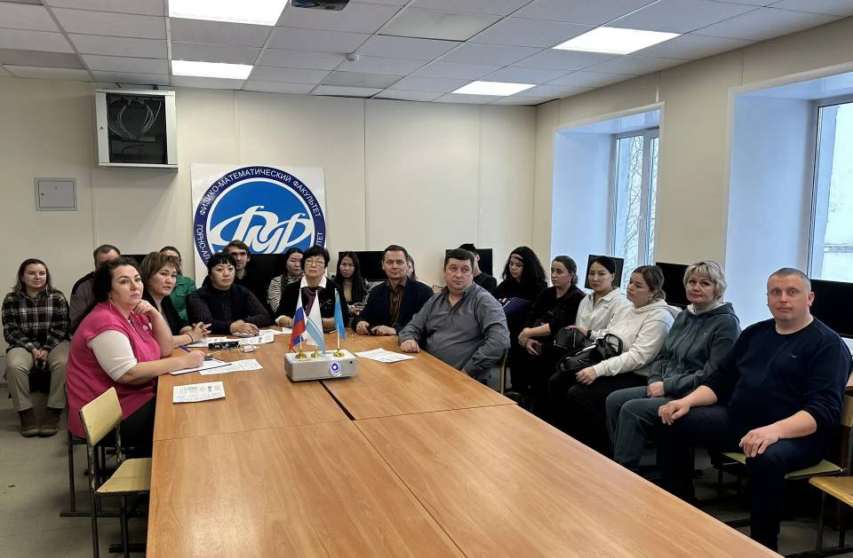 Во время проведения занятий с зарубежными студентами из Казахстана общался декан факультета, к.п.н., доцент Николай Сергеевич Часовских. Ценные рекомендации были даны нашим и зарубежным студентам в ходе диалога с заведующей кафедрой математики, физики и информатики, к.ф.-м.н., доцента Радой Александровной Богдановой по организационно-педагогическим вопросам.